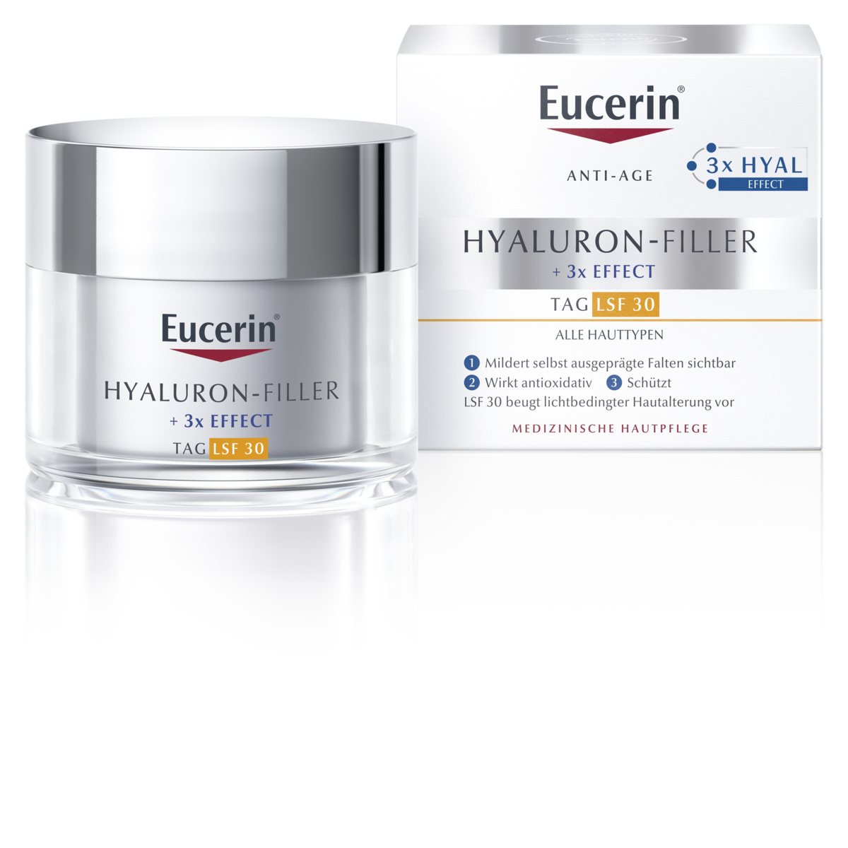 -Az Eucerin® Hyaluron-Filler + Volume-Lift a bőr öregedésével kialakuló mélyülő ráncokat, volumen-, kontúr- és feszességvesztést kezeli. Feltölti a mély ráncokat és újradefiniálja az arc kontúrjait az lifting hatás érdekében.