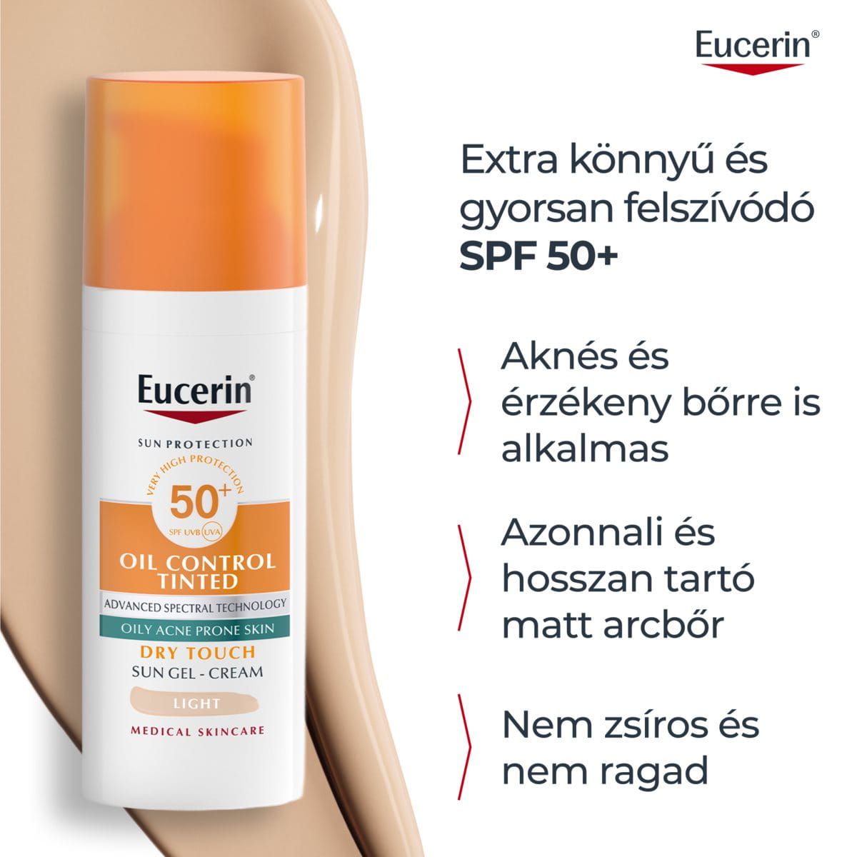 Az Eucerin Sun színezett napozó krém-gél arcra FF50+ mindennapos használatra szánt, színezett fényvédő arckrém zsíros és aknéra hajlamos bőrre. Az Eucerin innovatív Szélesspektrumú Fényvédelmi Technológiája (Advanced Spectral Technology) a magas szintű UV-védelem érdekében egyesíti a szélessávú és fotostabil UVA/UVB-szűrőket és a licochalcone A hatóanyagot, mely semlegesíti az UV-fény és a HEVIS következtében létrejött szabadgyököket. A napozókrém fényvédő licirretinsavat is tartalmaz, amely támogatja a bőr saját DNS-javító mechanizmusát.
