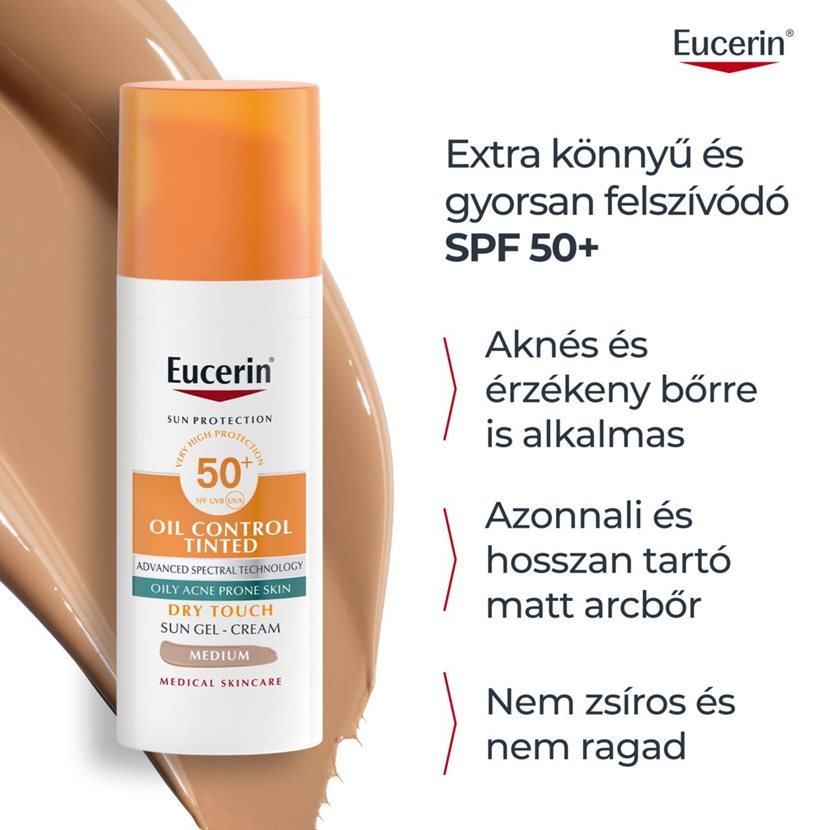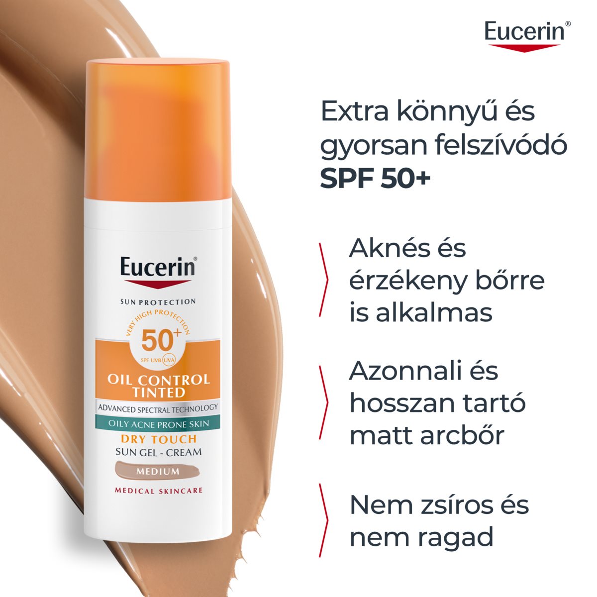 Az Eucerin Sun Oil Control színezett napozó krém-gél arcra SPF50+ mindennapos használatra szánt, színezett fényvédő arckrém zsíros és aknéra hajlamos bőrre. Az Eucerin innovatív Szélesspektrumú Fényvédelmi Technológiája (Advanced Spectral Technology) a magas szintű UV-védelem érdekében egyesíti a szélessávú és fotostabil UVA/UVB-szűrőket és a licochalcone A hatóanyagot, mely semlegesíti az UV-fény és a HEVIS következtében létrejött szabadgyököket. A napozókrém fényvédő glicirretinsavat is tartalmaz, amely támogatja a bőr saját DNS-javító mechanizmusát.