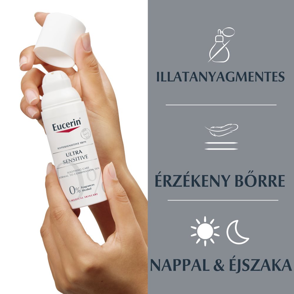 Az Eucerin® UltraSensitive arcápoló normál, vegyes bőrre egy "mentes" termék, azaz csak korlátozott számú összetevőket tartalmaz. A csomagolást úgy tervezték, hogy megóvja a terméket a szennyeződésektől a kettős szeleprendszernek köszönhetően.