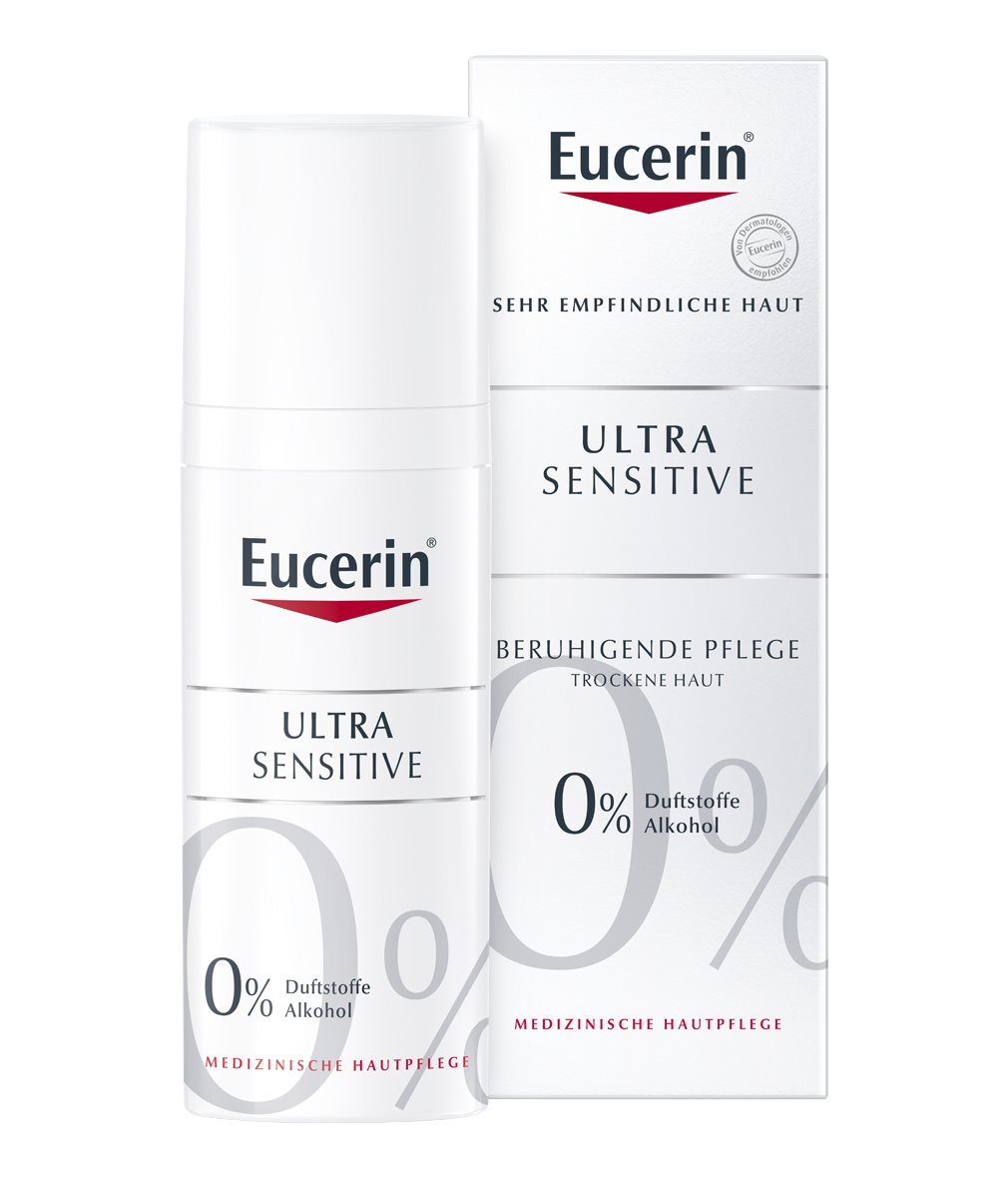 Az Eucerin® UltraSensitive arcápoló száraz bőrre termék hiperérzékeny bőrre ajánlott, melynek fő jelei a kellemetlen, égő, feszülő vagy viszkető érzés bőrpír szemmel látható megjelenése nélkül. Az alaposan megtisztított bőrre kell felvinni, azonnal megnyugtatja a száraz, hiperérzékeny bőrt és hosszan tartó komfortérzetet nyújt, miközben a krémben levő speciális hatóanyagok táplálják és hidratálják a bőrt. A termék használható arcon, nyakon és dekoltázson is.