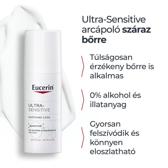 Az Eucerin® UltraSensitive arcápoló száraz bőrre termék hiperérzékeny bőrre ajánlott, melynek fő jelei a kellemetlen, égő, feszülő vagy viszkető érzés bőrpír szemmel látható megjelenése nélkül. Az alaposan megtisztított bőrre kell felvinni, azonnal megnyugtatja a száraz, hiperérzékeny bőrt és hosszan tartó komfortérzetet nyújt, miközben a krémben levő speciális hatóanyagok táplálják és hidratálják a bőrt. A termék használható arcon, nyakon és dekoltázson is.