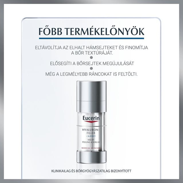 Az Eucerin Hyaluron-Filler Night bőrtápláló éjszakai hidratáló arckrém, mely láthatóan feltölti a finom ráncokat és redőket. Dexpanthenolt is tartalmaz, mely az éjszaka során segíti a bőr regenerációját. Az Eucerin Hyaluron-Filler Éjszakai Bőrmegújító Peeling és Szérum arra fejlesztették ki, hogy az Eucerin Hyaluron-Filler Night termékkel együtt alkalmazva kétszeres hatékonysággal tegyék simává és sugárzóvá az arcbőrt. A gél állagú formulában nagy és kis molekulasúlyú hialuronsav egyaránt megtalálható (3), míg az emulzió glicin-szaponint és hatékony AHA (alfa-hidroxi sav) komplexet tartalmaz a hámlasztás érdekében. Az AHA vegyületek közül sokat gyümölcssavakként ismerünk.