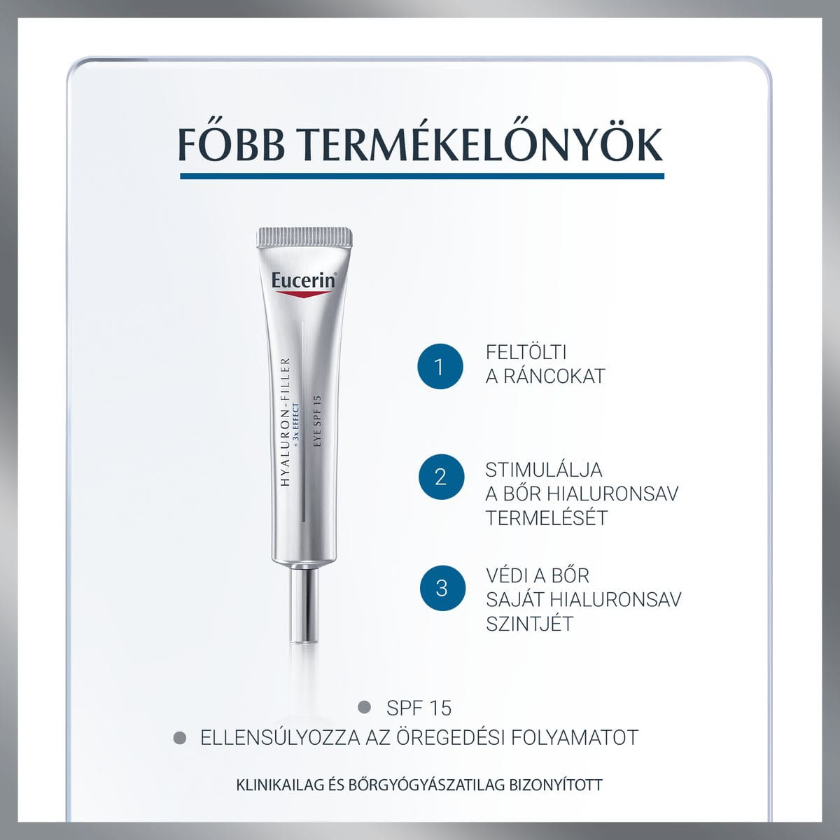 Az Eucerin Hyaluron-Filler Ráncfeltöltő szemránckrém az öregedés első jelei, például a „szarkalábaknak" nevezett finom ráncok ellen hat a kényes szemkörnyéki területen. Láthatóan feltölti a finom redőket, sőt még a mély ráncokat is, és a bőrt fiatalosabb megjelenésűvé teszi. Hatékonyan megelőzi az UV-sugárzás okozta fényöregedést (a napsütés hatására bekövetkező idő előtti öregedést), megakadályozza, hogy a ráncok mélyebbé váljanak, és védi a bőrt a szabadgyökök ellen.
